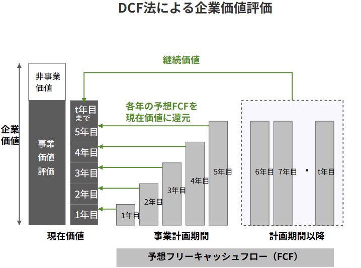 DCF(Discounted Cash Flow)法とは、譲渡企業や譲受企業の将来キャッシュフローを現在価値に換算し、企業価値を導く評価手法です。